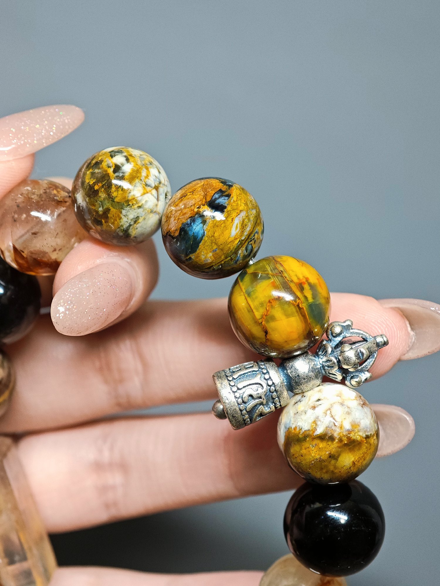 • Pietersite: The "wildness of the path, tamed by grace." Its swirling blue-gold patterns evoke the chaos of wind through undergrowth, yet its polished finish reflects the order beneath—much like bamboo thriving in wildness with effortless poise. It fuels courage to embrace life’s "wild paths" with calm confidence.