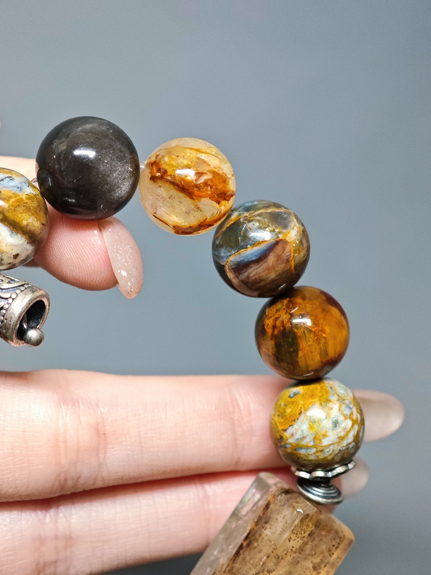 • Silver Sheen Obsidian: The "secluded soul’s quiet dream." Its dark, glossy surface shimmers with silver flecks like moonlight on bamboo leaves at night, holding the stillness of "long dreams." A stone of introspection, it calms the mind, helping you sink into moments of peace—just as a hermit rests amid nature’s hush.