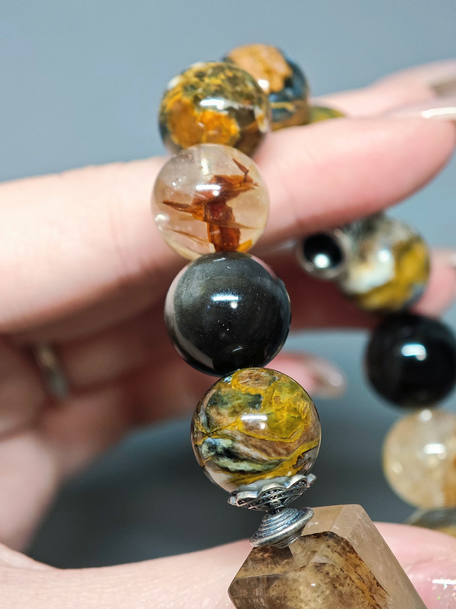 "Bamboo CharmWith empty heart, it stands on wild paths,Clear shadows sway 'neath the setting sun.Wind passes, carrying elegant rhyme,A secluded soul rests in long dreams. Opal, Yellow Rutilated Quartz, Small Tree Rutilated Quartz, Silver Sheen Obsidi