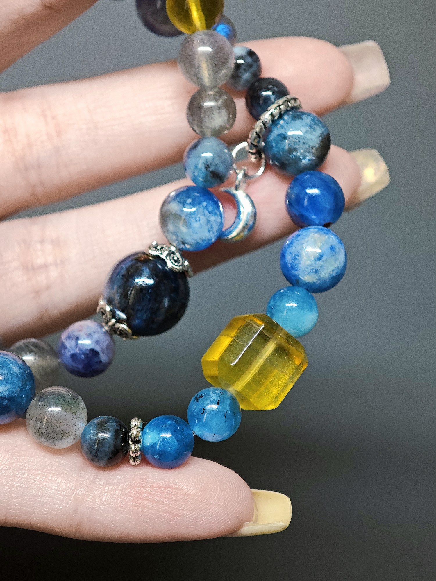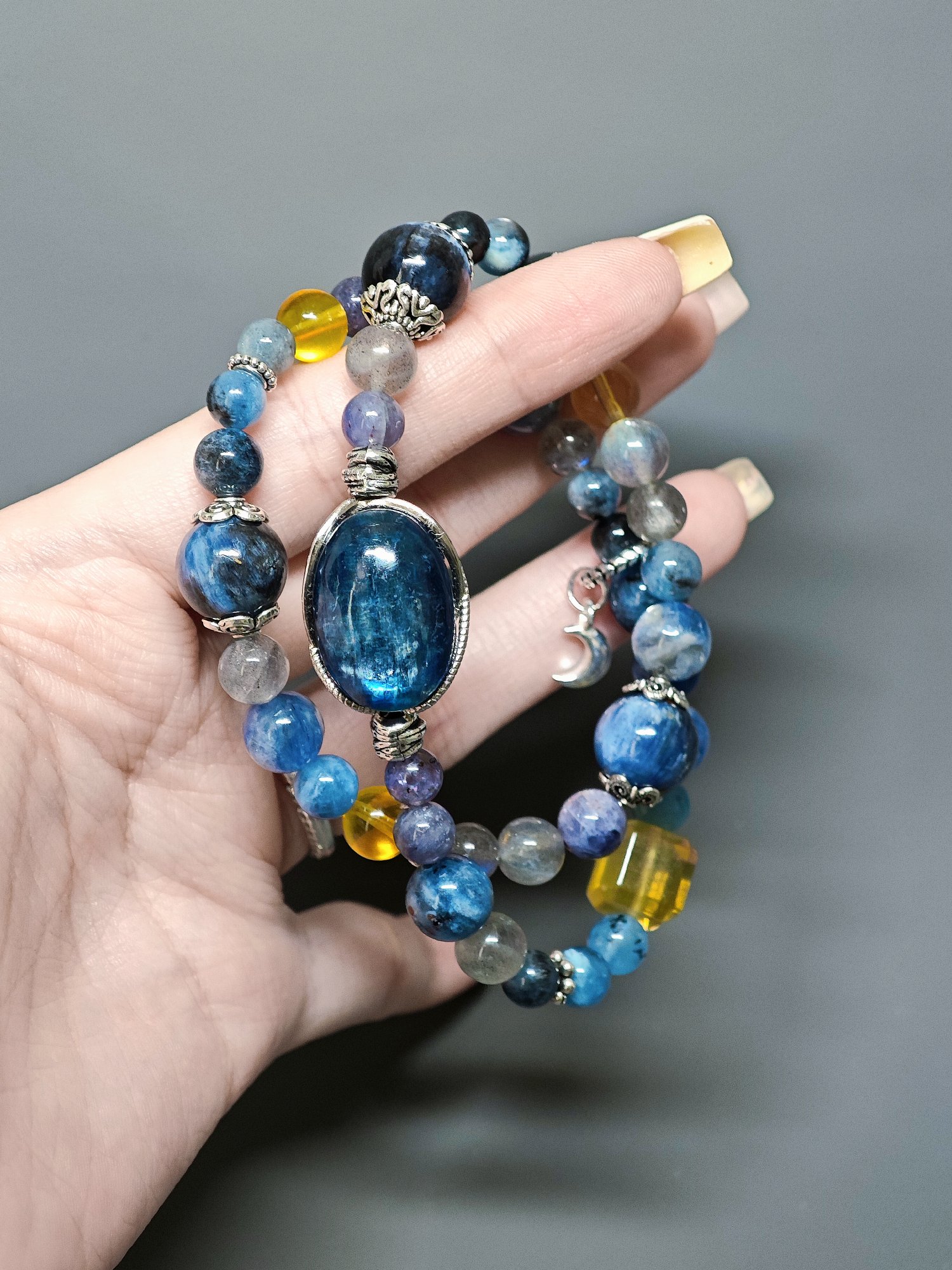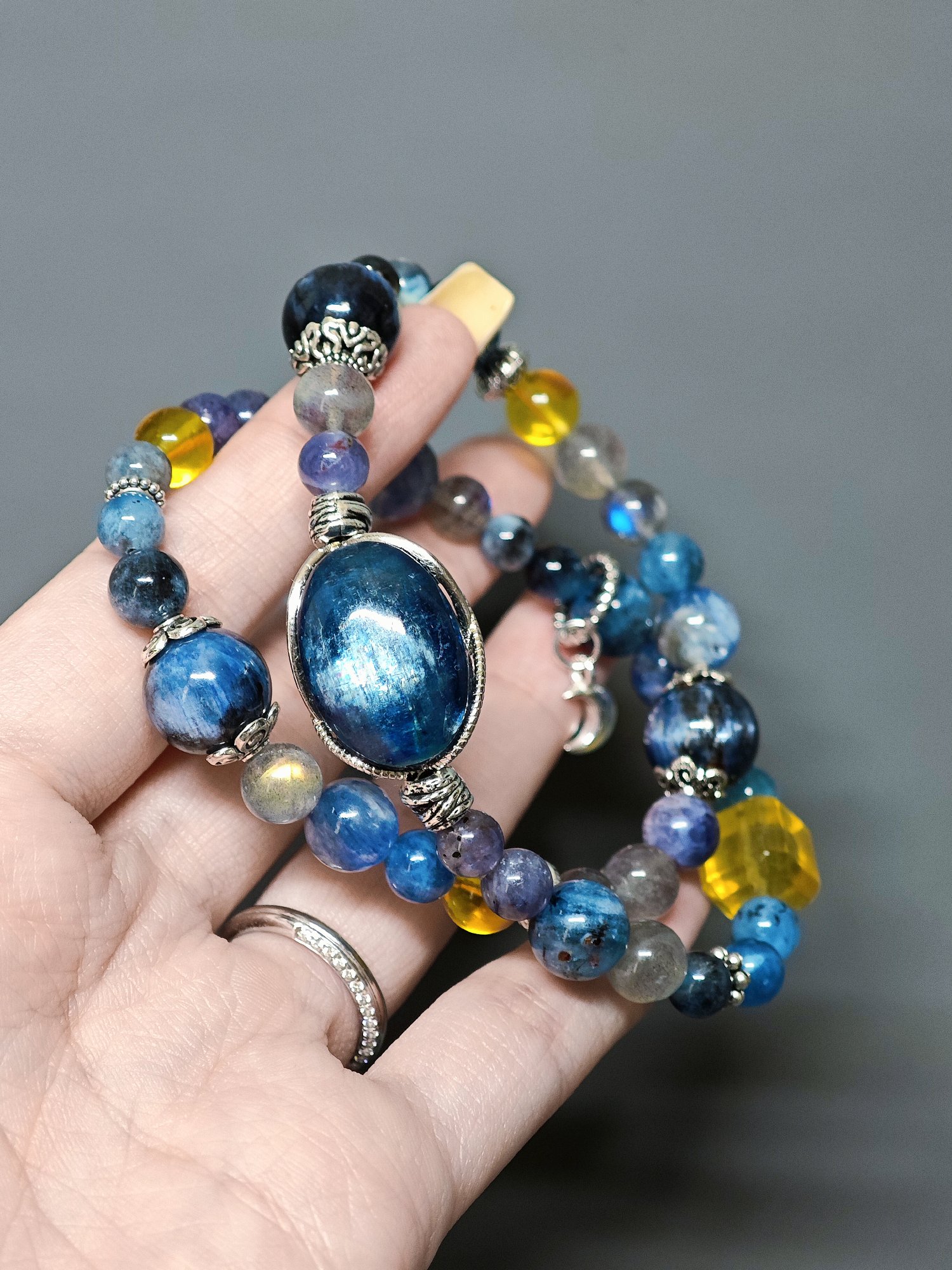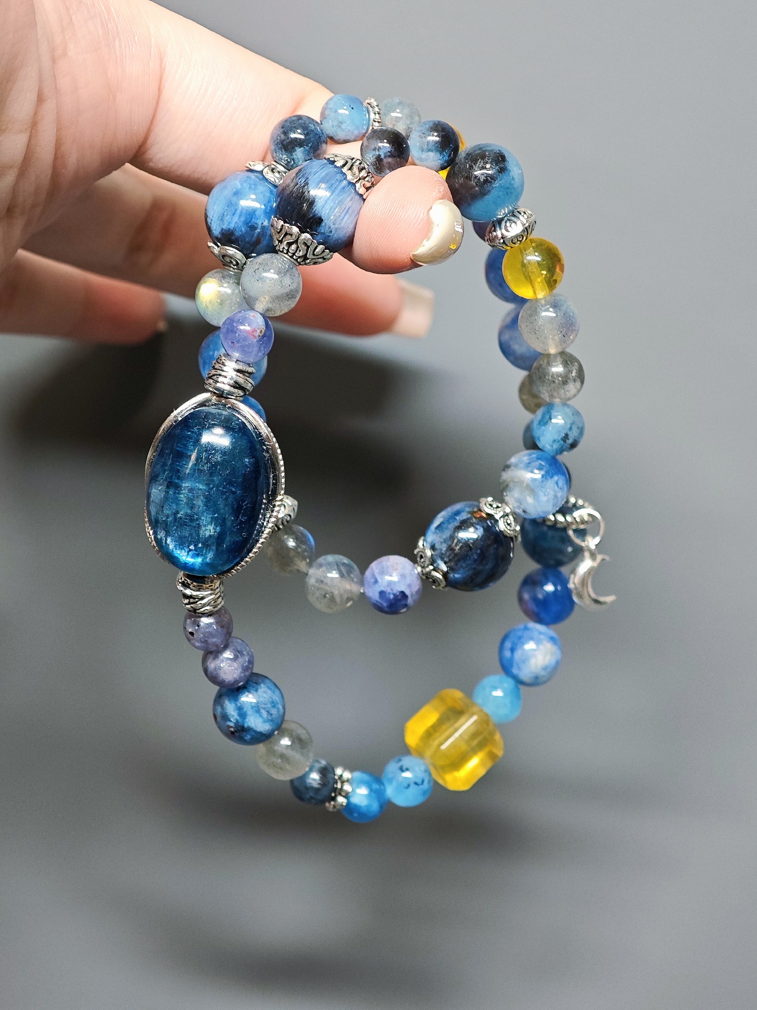 "Chasing StarsNight falls silent, the river of stars stirs,Wind whispers soft, chasing shadows deep.A thousand mountains pass behind,Each step treads on a star. Kyanite, Dumortierite, Yellow Fluorite, Aquamarine, Gray Moonstone"