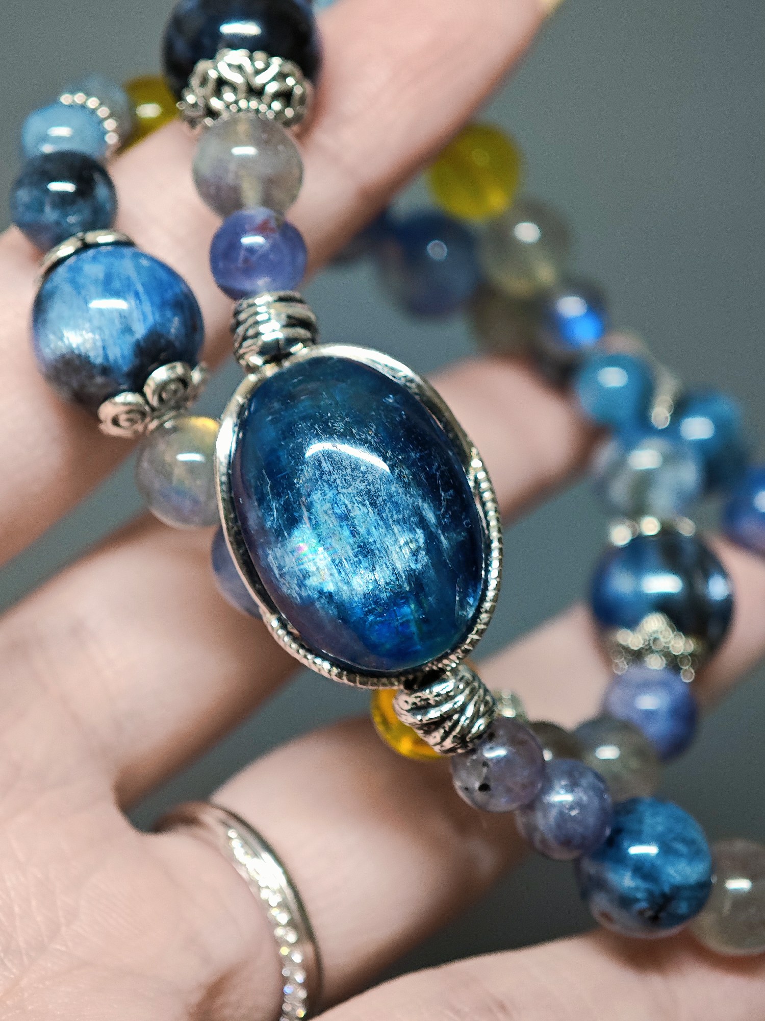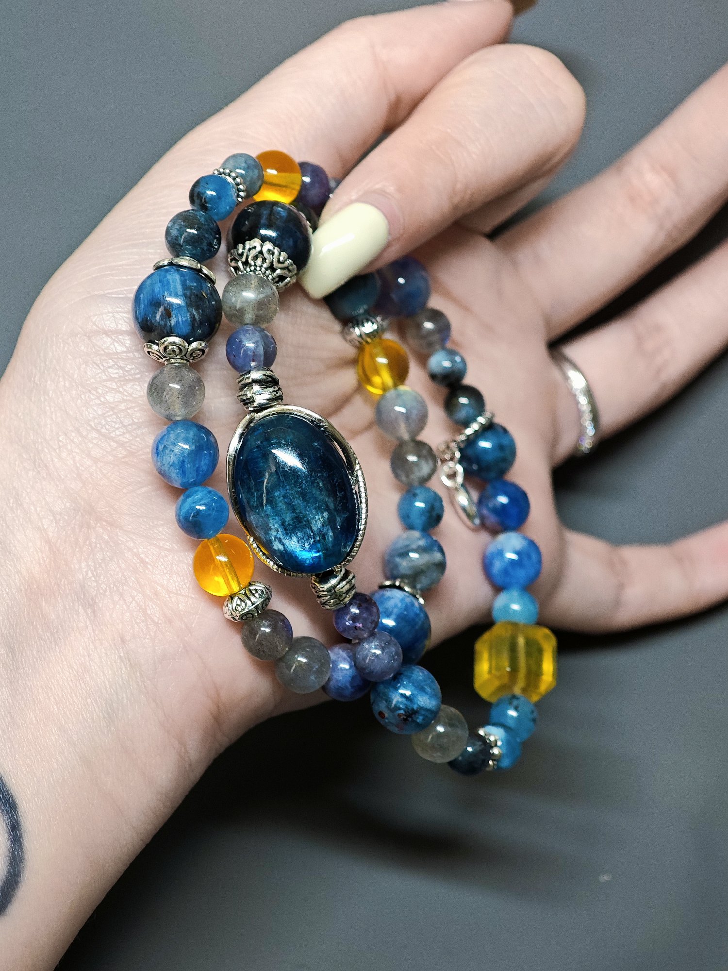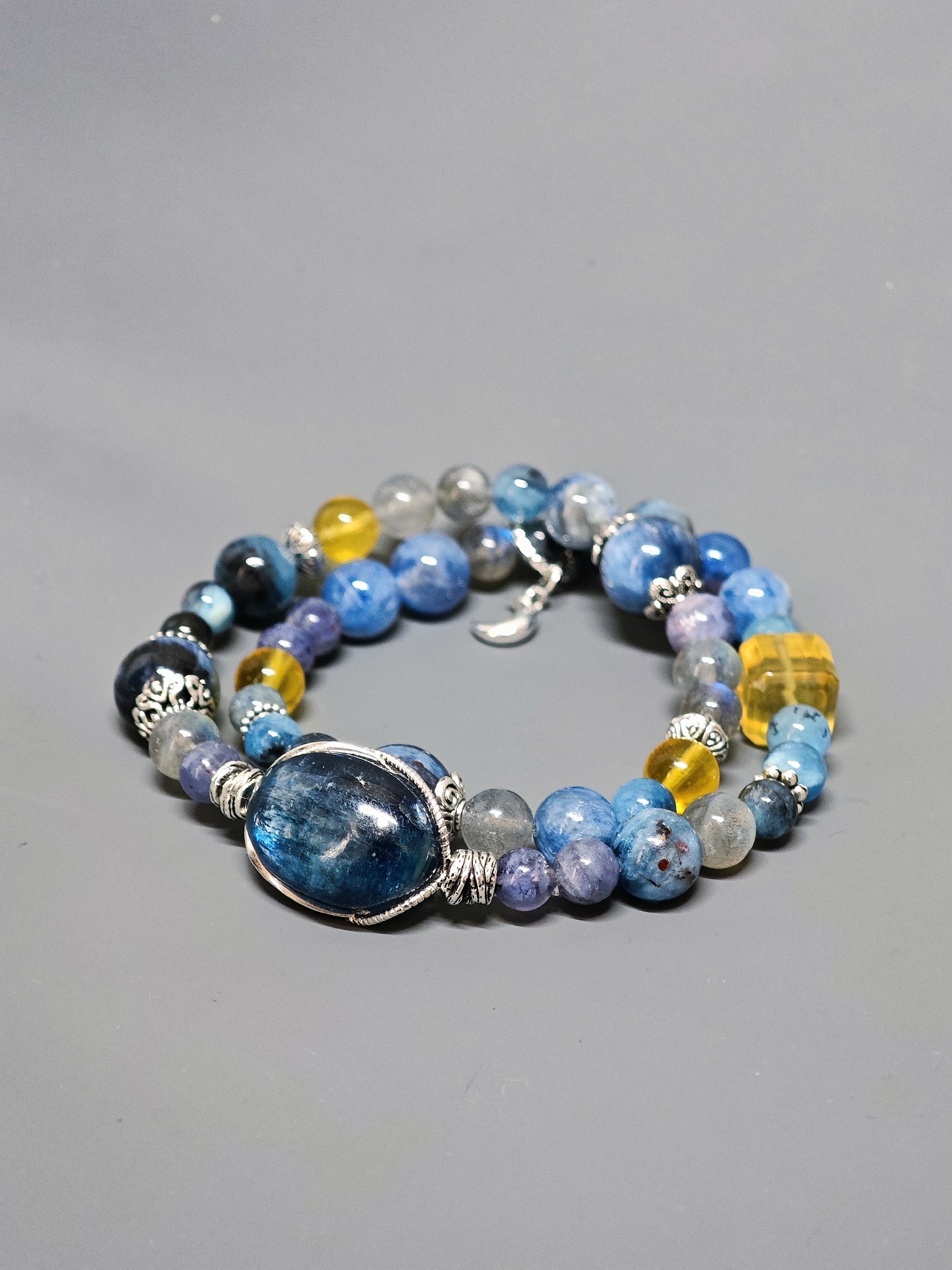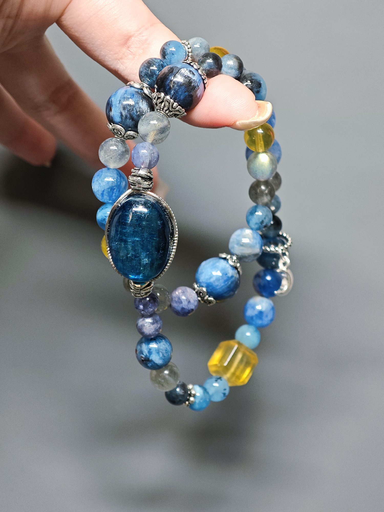 "Chasing StarsNight falls silent, the river of stars stirs,Wind whispers soft, chasing shadows deep.A thousand mountains pass behind,Each step treads on a star. Kyanite, Dumortierite, Yellow Fluorite, Aquamarine, Gray Moonstone"