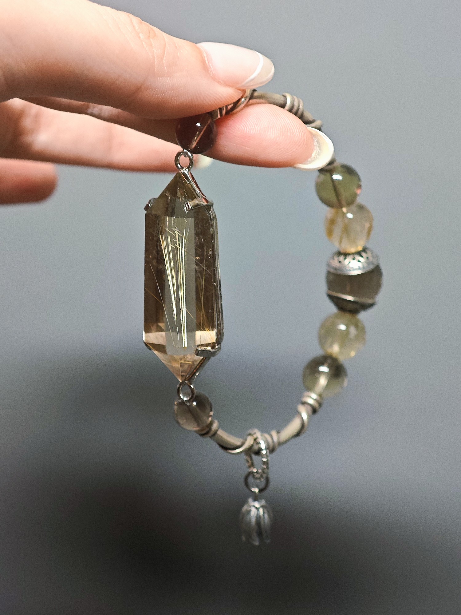 • Golden Rutilated Quartz: The "golden threads of morning light." Fine, radiant gold needles slice through clear quartz like the sun’s first rays sneaking through glass cracks—bright, precise, and alive with the energy of "today’s wakefulness." It embodies the light that "stitches" dreams to reality, turning the intangible (a dream, a hope) into something tangible, something real. This stone sparks clarity, weaving the magic of the night into the purpose of the day.
