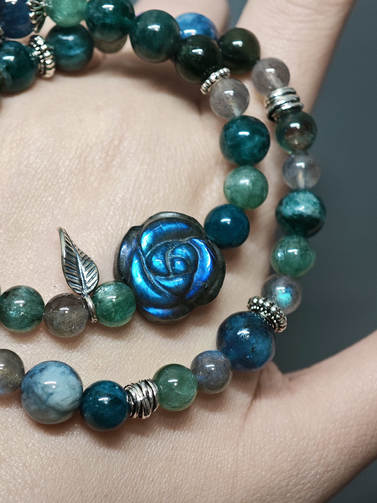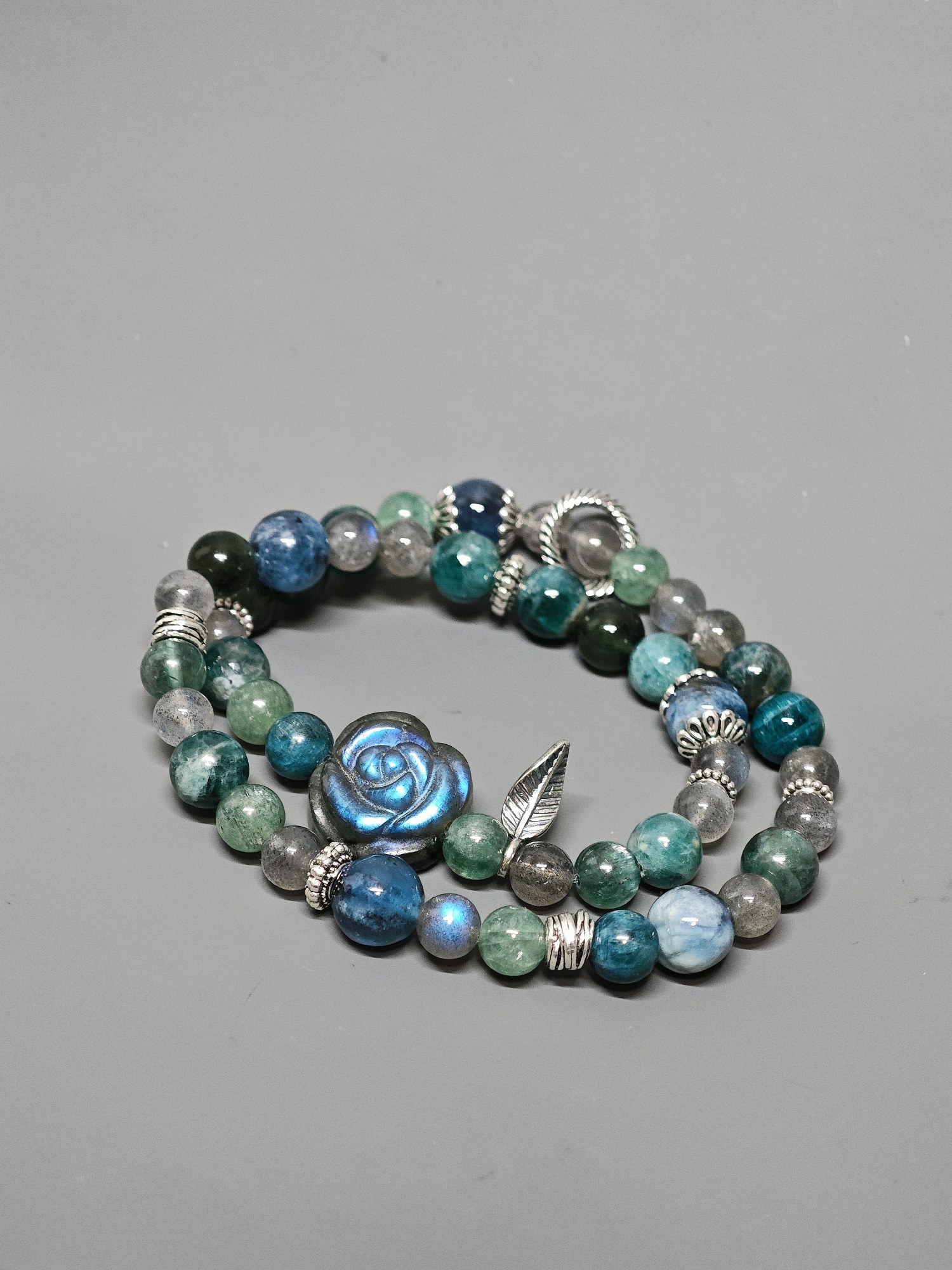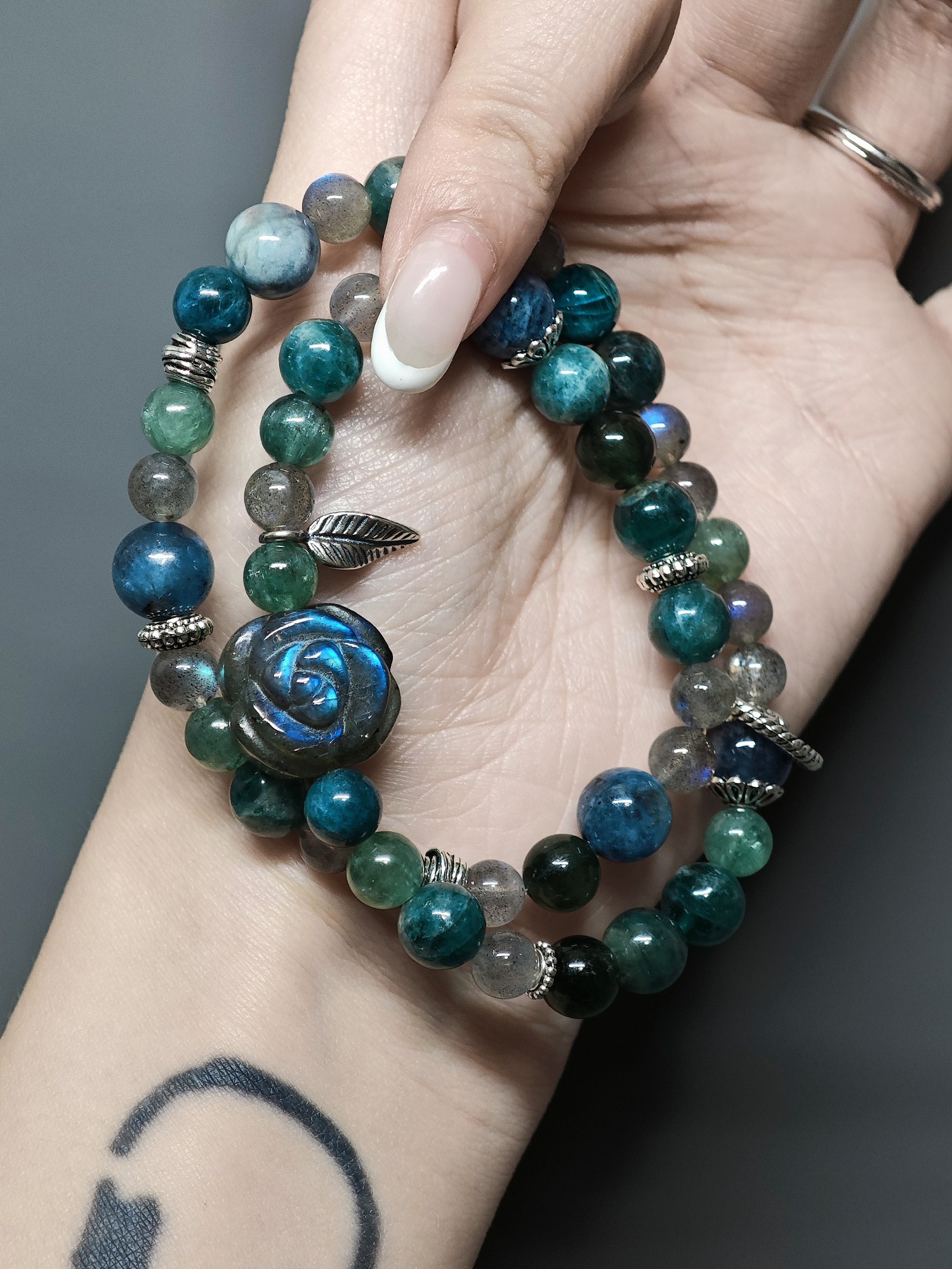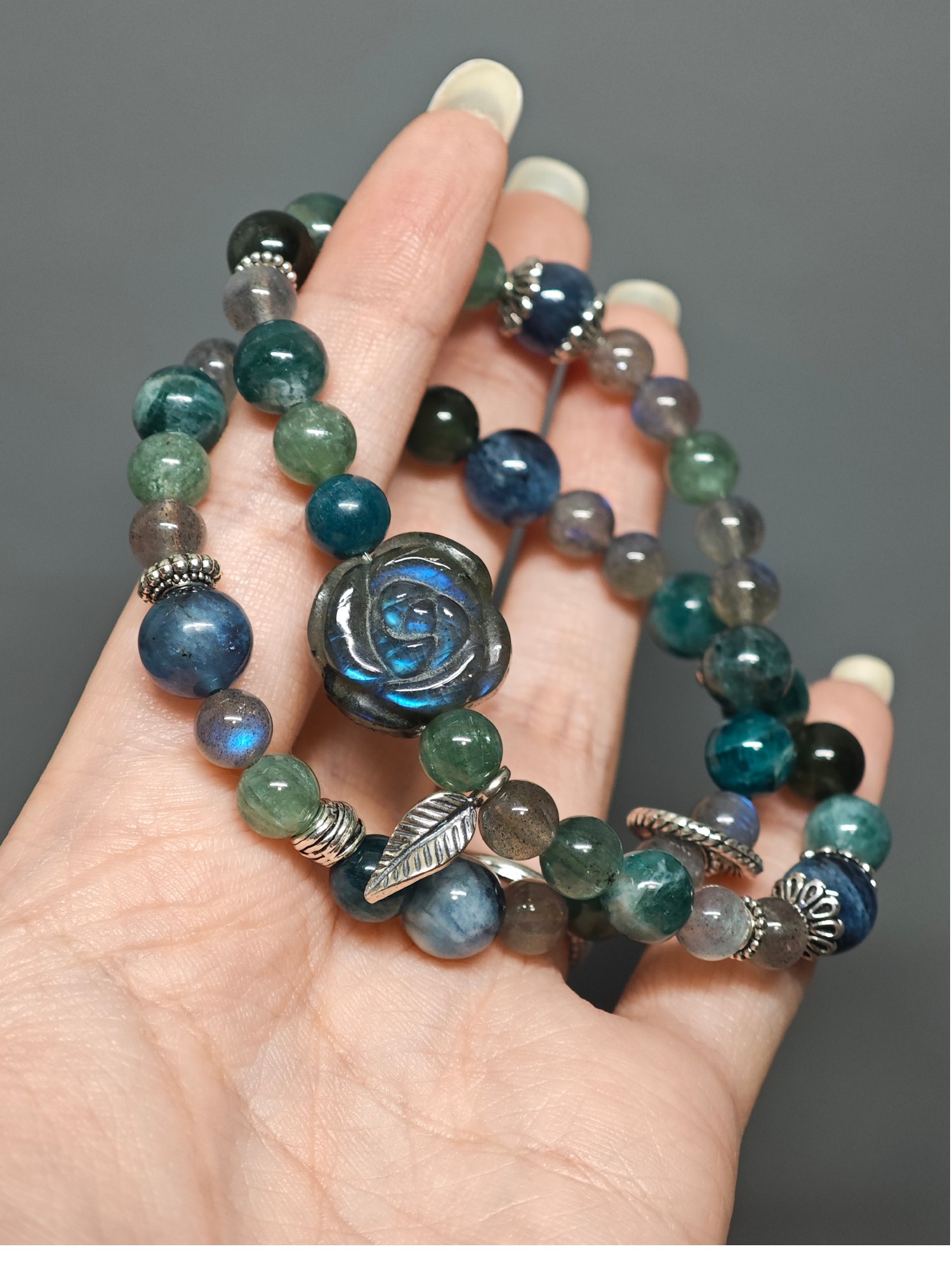 Let the quiet magic of moonlit transformation wrap around you with "Moon Rose 4.0," a collection that captures the poem’s tender alchemy: roses whose thorns, once sharp, soften into "tender silver" beneath the moon. Woven from labradorite, blue apatite, green rabbit-hair quartz, and aquamarine, each stone mirrors the rose’s duality—wild yet gentle, vivid yet serene—turning strength into a thing of beauty.
