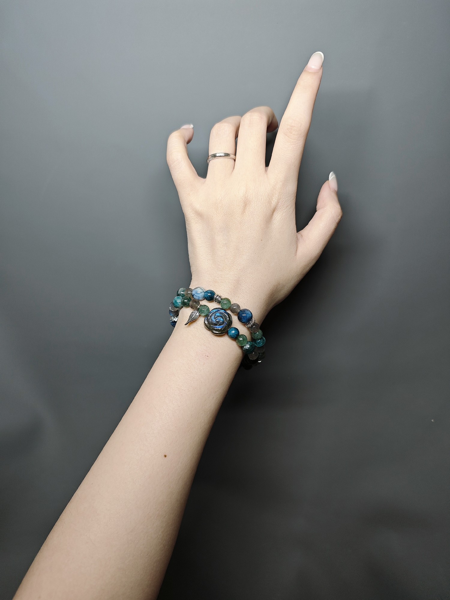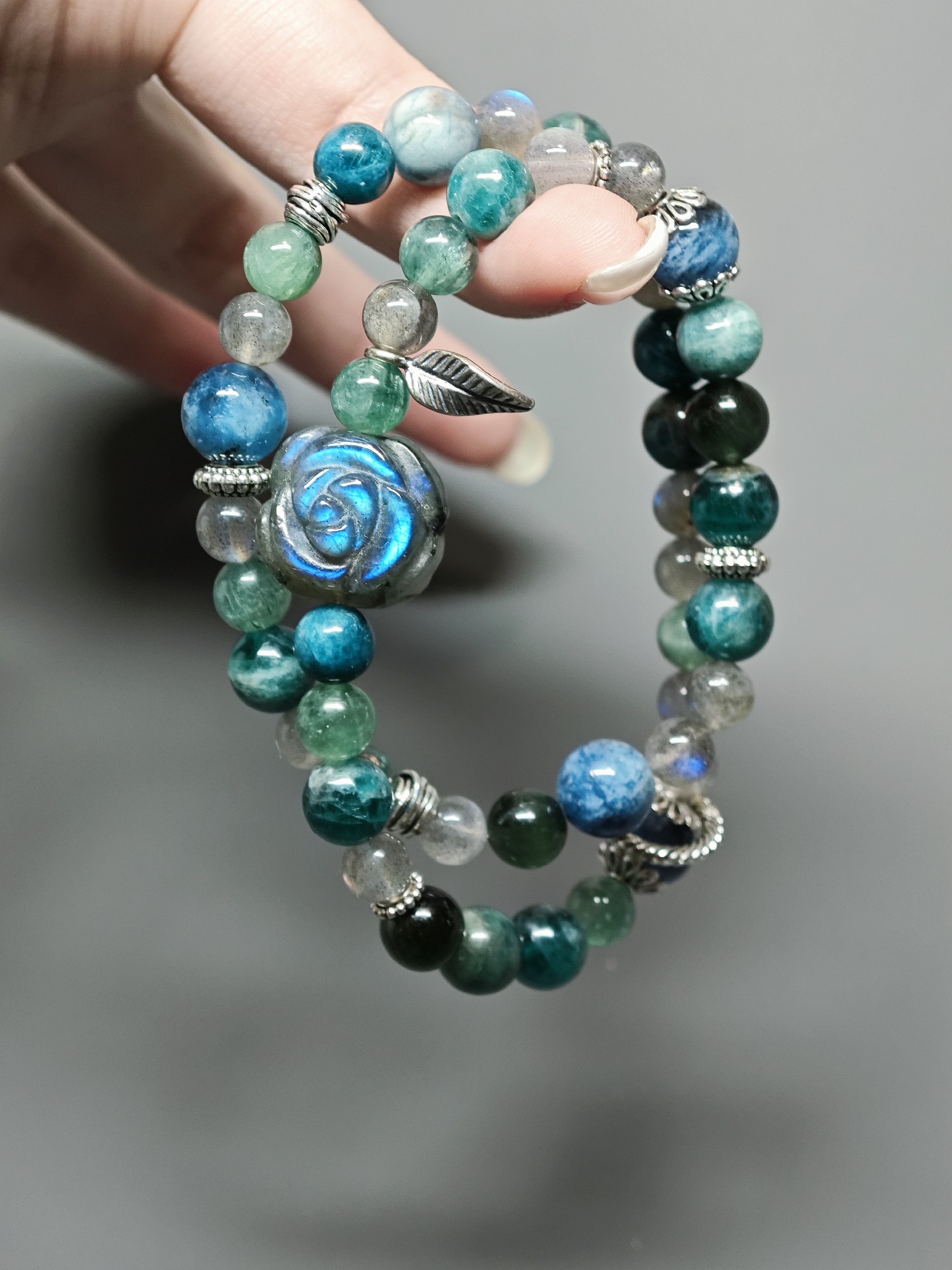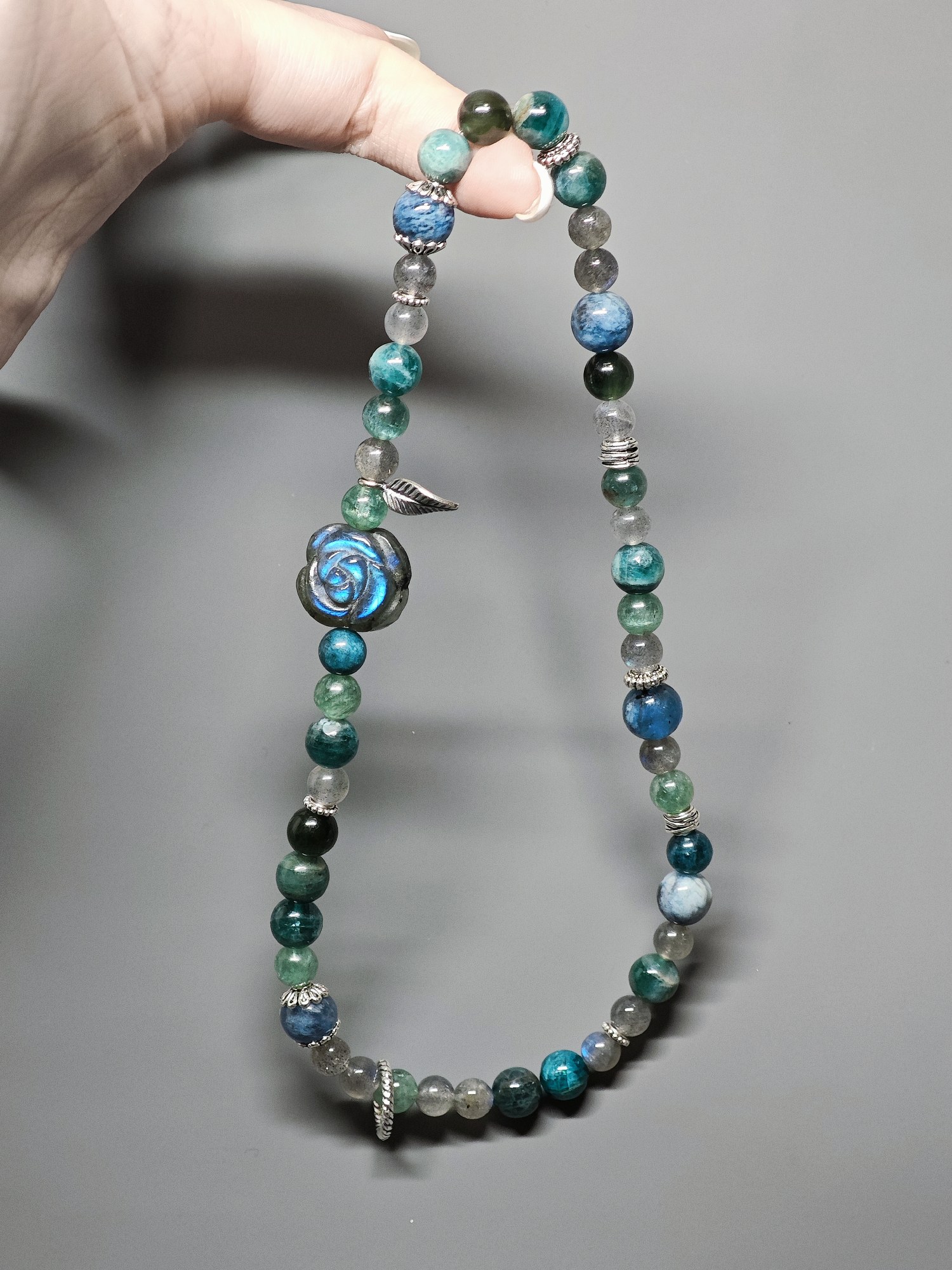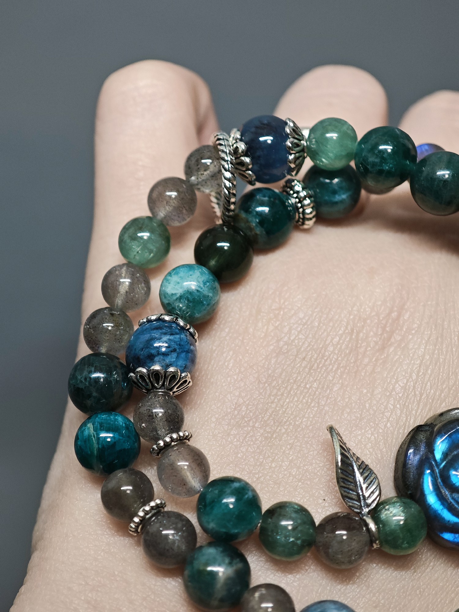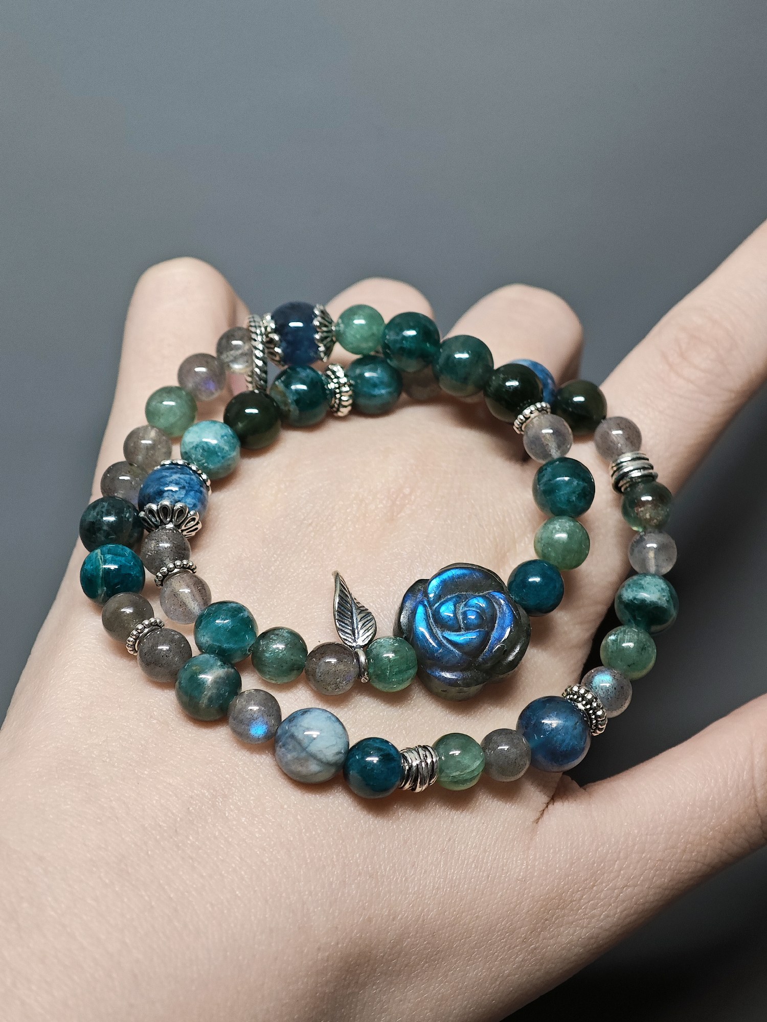 Let the quiet magic of moonlit transformation wrap around you with "Moon Rose 4.0," a collection that captures the poem’s tender alchemy: roses whose thorns, once sharp, soften into "tender silver" beneath the moon. Woven from labradorite, blue apatite, green rabbit-hair quartz, and aquamarine, each stone mirrors the rose’s duality—wild yet gentle, vivid yet serene—turning strength into a thing of beauty.
