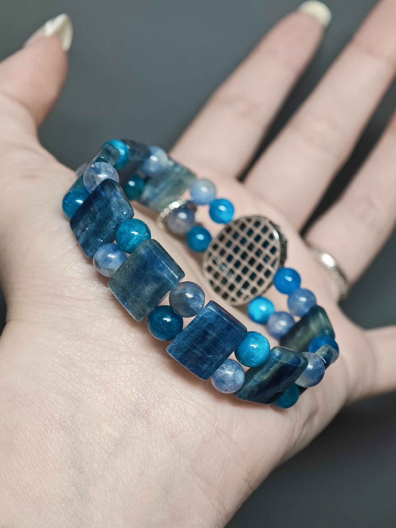 Home / Art-product / "Ode to the Sea [Bracelet]Go—let the waves sing your nameTo all shores yet unvisited. Kyanite, Blue Apatite, Apatite-Quartz"