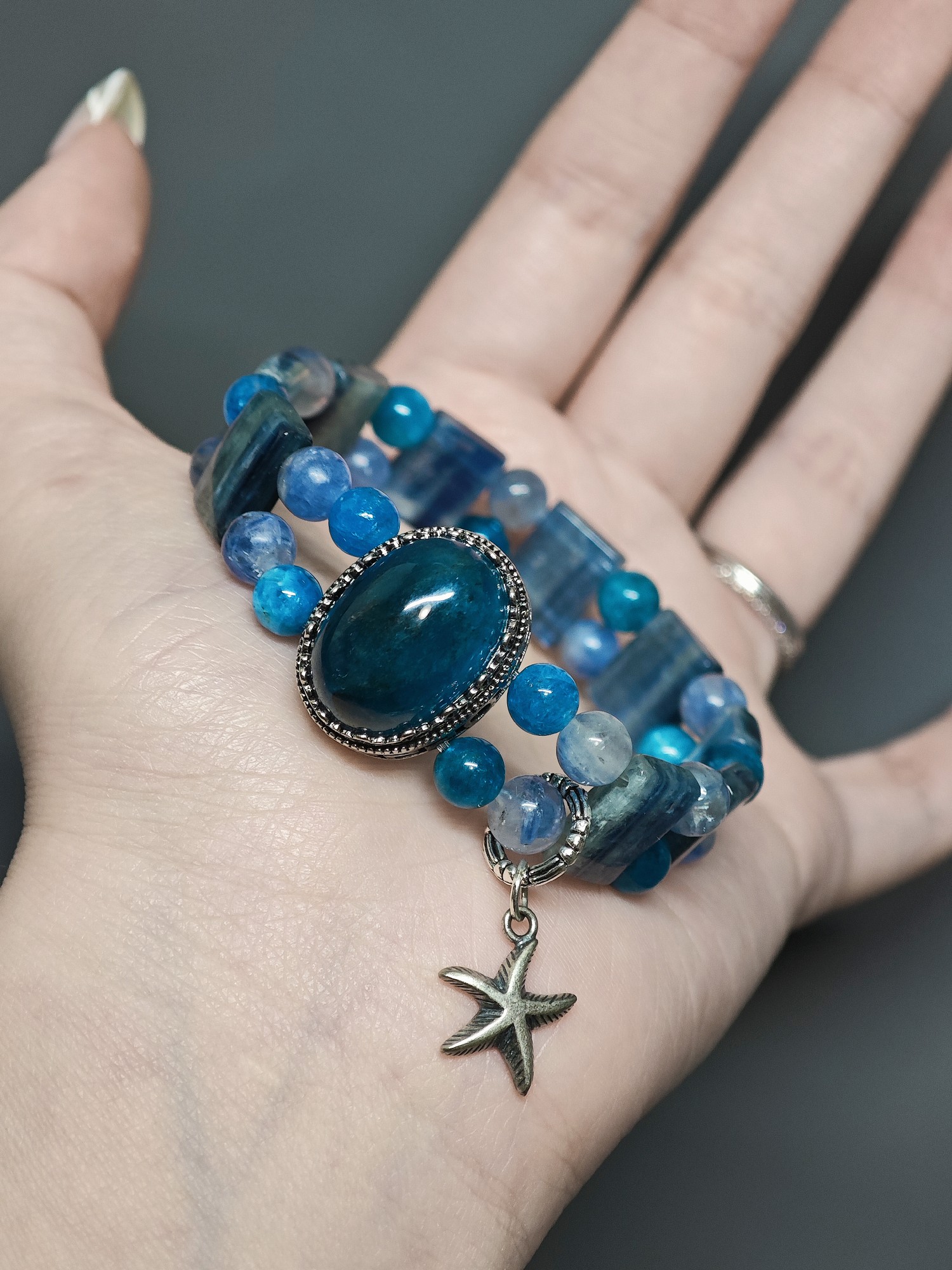 • Apatite-Quartz (Blue-Green Crystal): The "spark of foam on breaking waves." Swirled with aquamarine and clear quartz, it shimmers like sunlight on cresting waves—bright, dynamic, and alive with the energy of motion. It captures the "singing" of the waves: the frothy, exuberant joy of carrying a name to new shores, turning your journey into a celebration. It’s the reminder that adventure isn’t just about reaching— it’s about the dance of the waves along the way.Crafted as a bold, fluid  (bracelet), the design mirrors the ocean’s movement: stones layered in a sweeping curve, kyanite’s "horizon" running through the center, blue apatite’s "depths" grounding the piece, and apatite-quartz’s "foam" sparkling at the edges. It’s a bracelet that feels like wearing a fragment of the sea—cool, alive, and full of momentum.