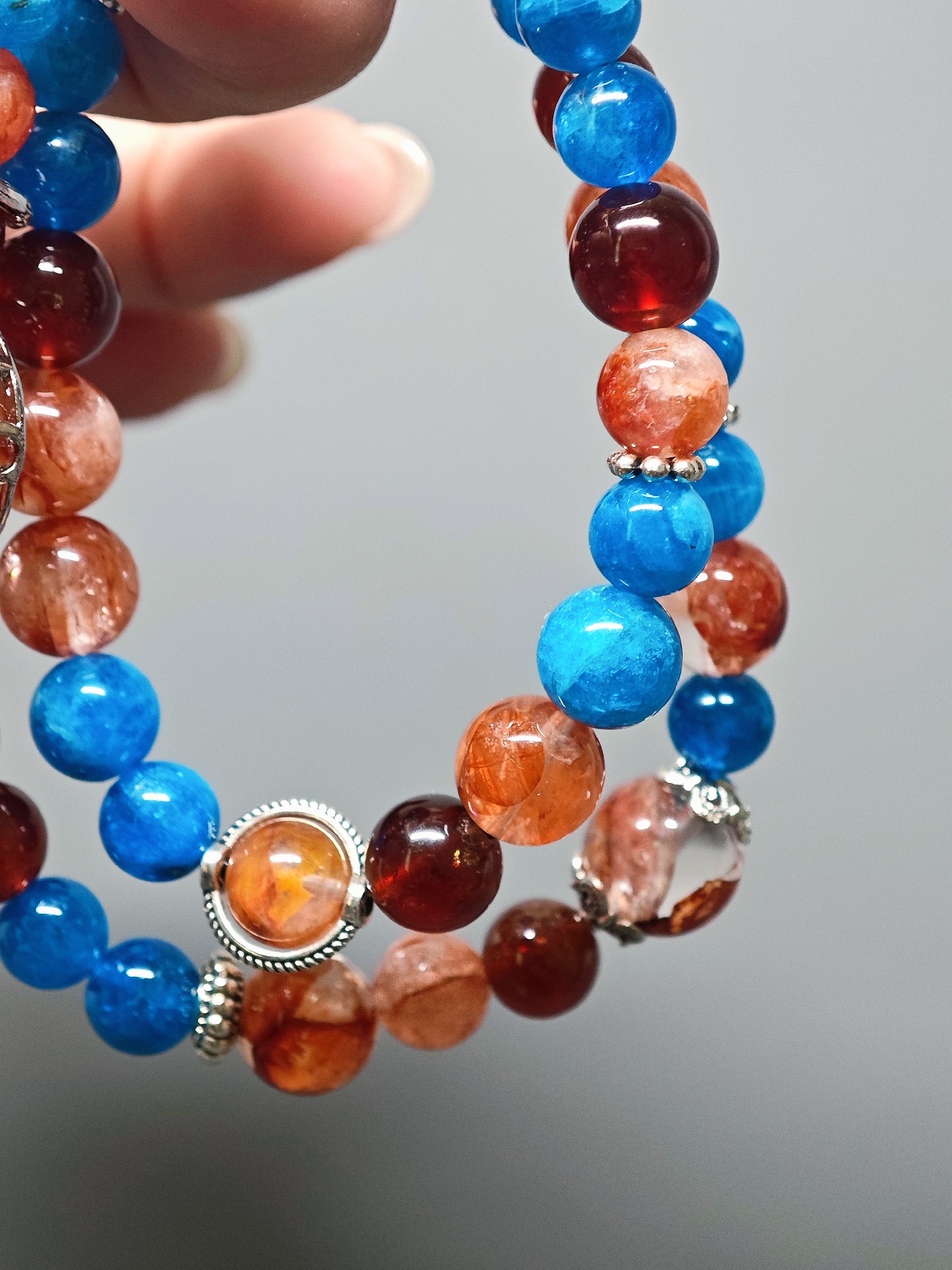 "Sea DuskThe setting sun falls into the sea’s folds,Burning the wave crests amber. Blue Apatite, Red Rutilated Quartz, Garnet"