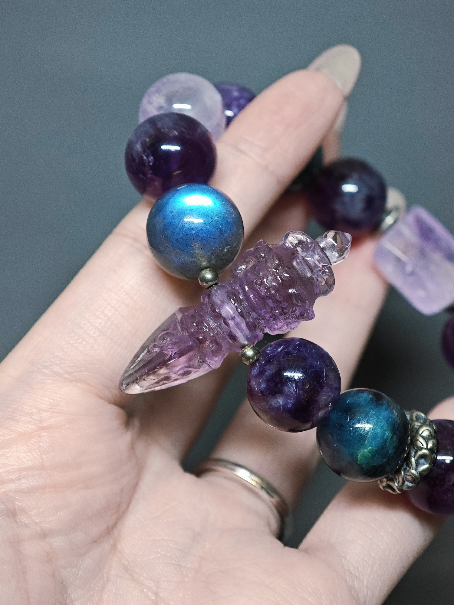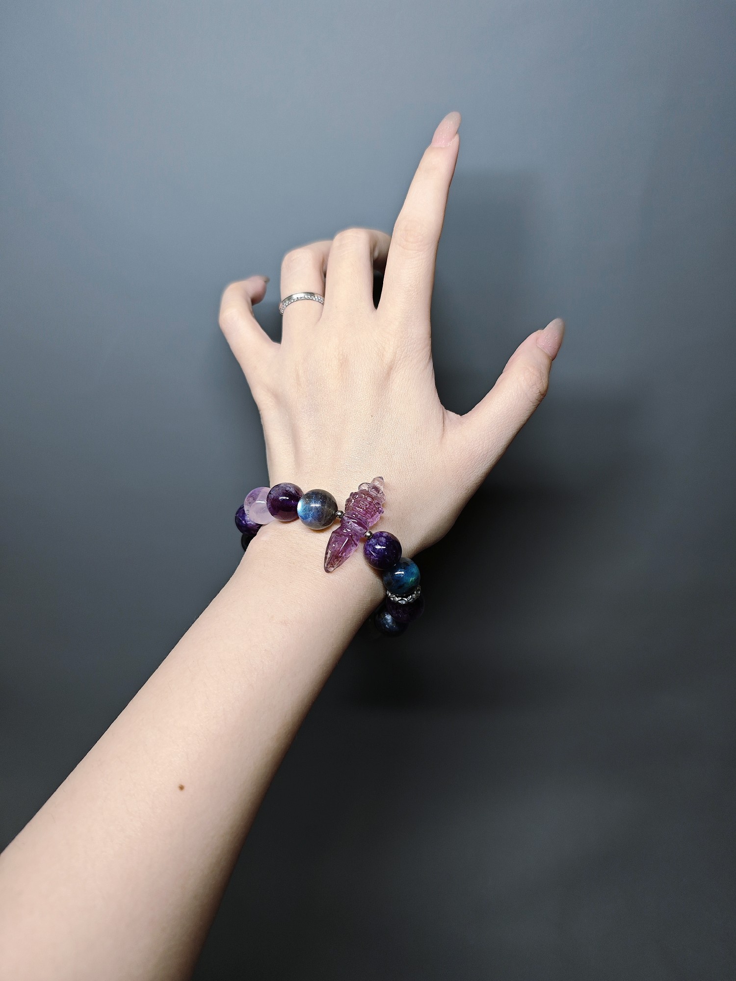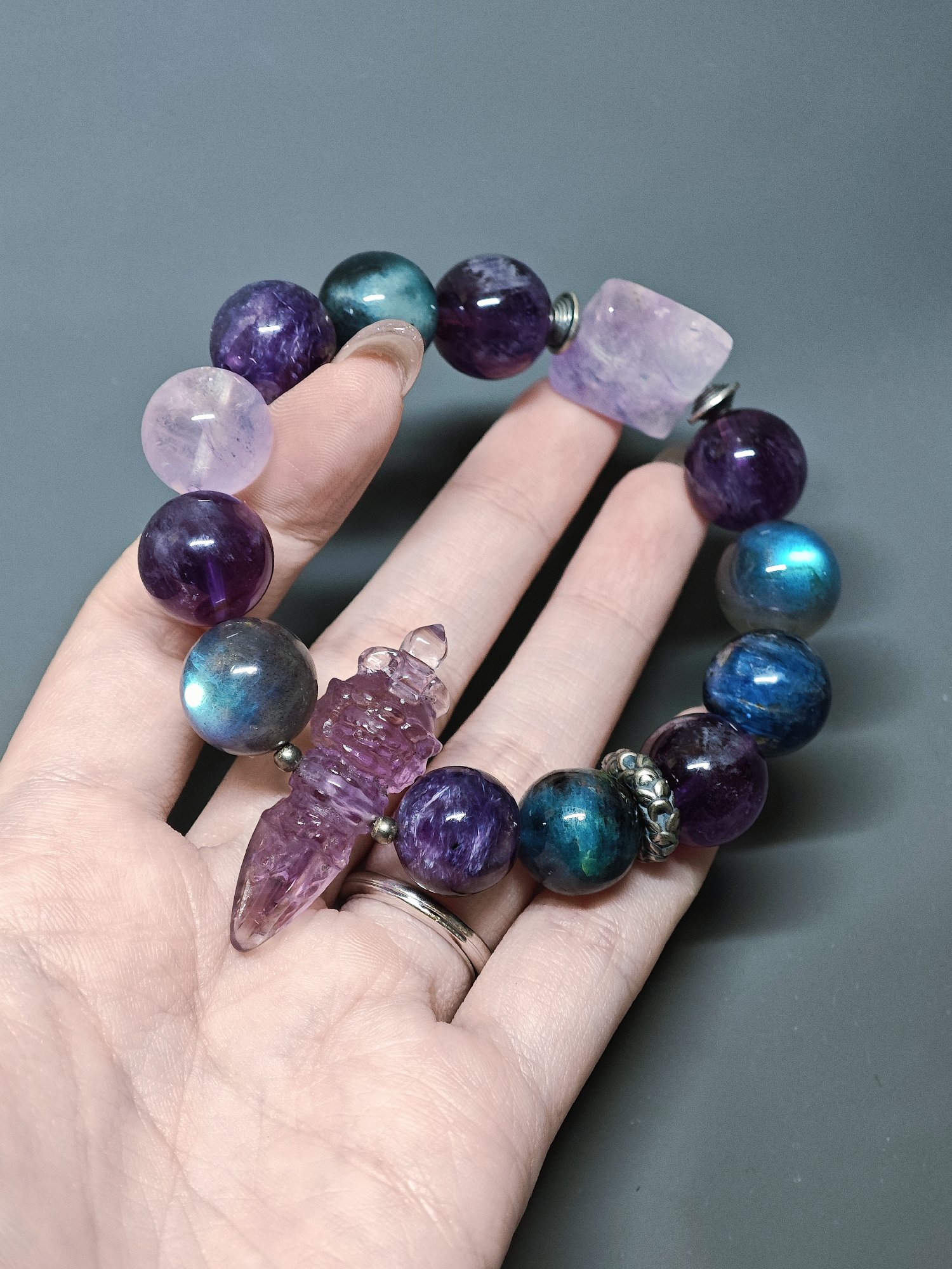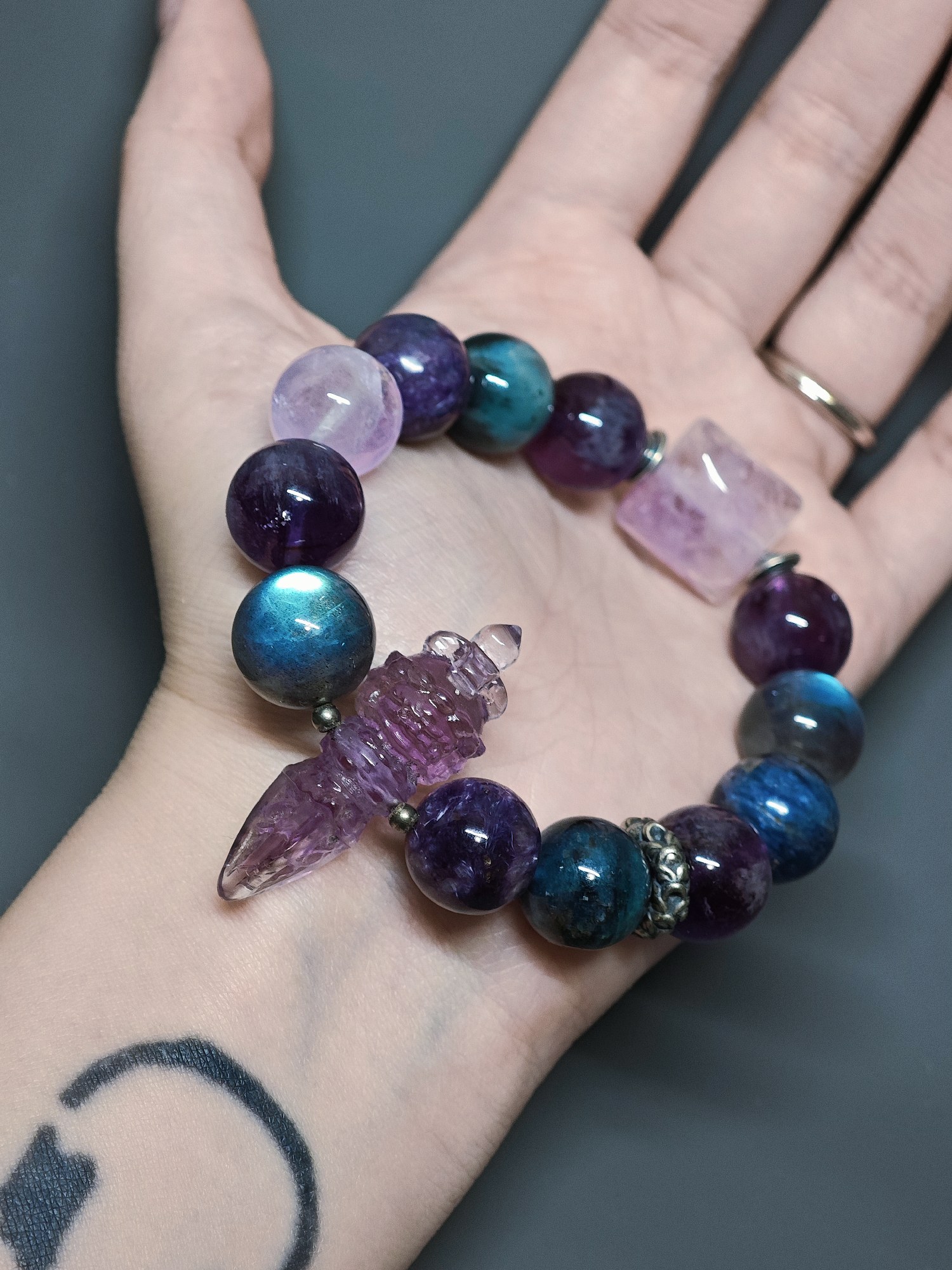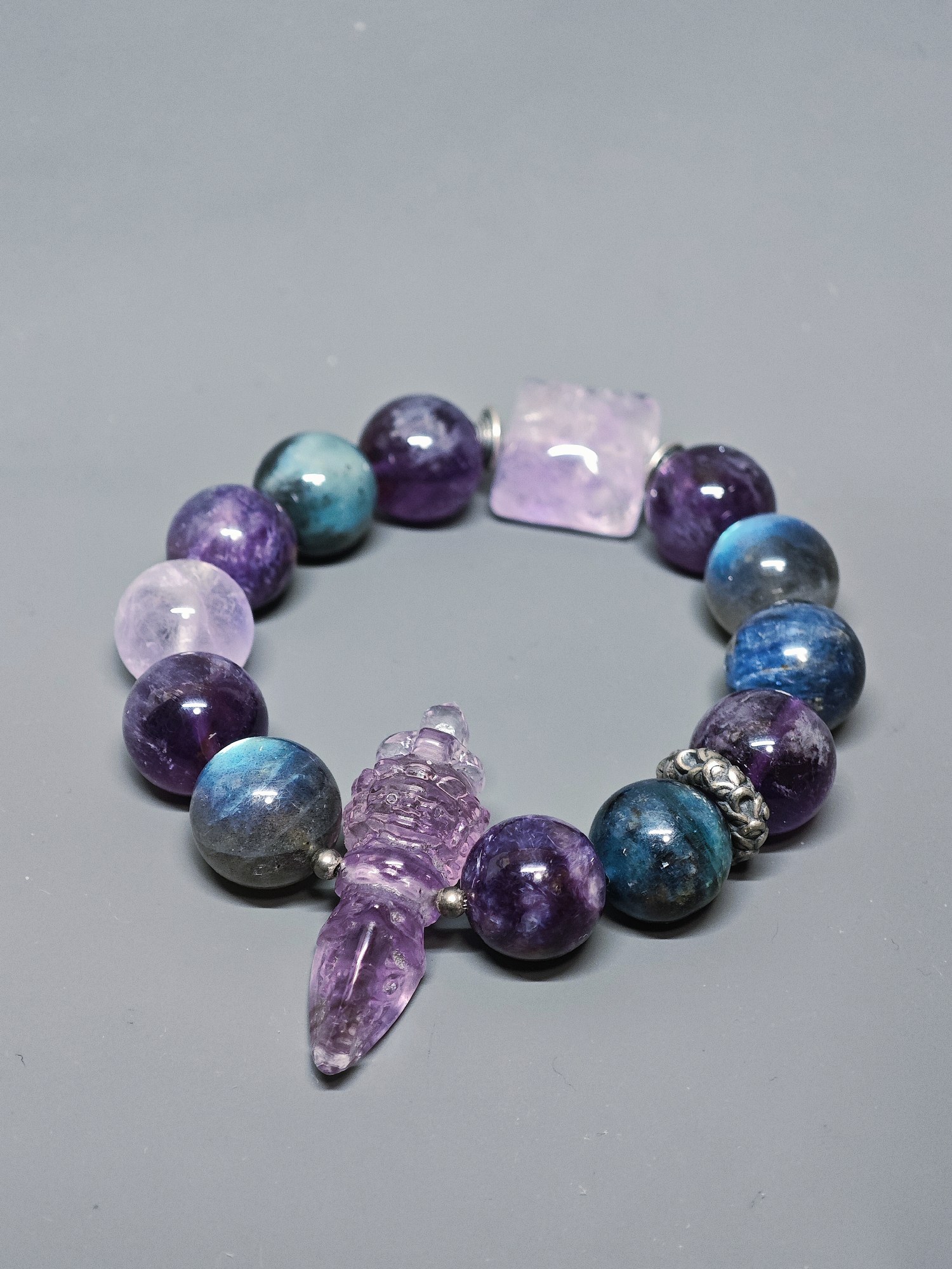 Crafted to evoke the rugged grace of a mountain ravine, the design layers these stones in a textured, organic arrangement: the deep sheen of hawk’s eye and obsidian forming the "ravine’s depths," kyanite’s clarity as the "pine song," gray tiger’s eye as the "stream," and blue opal as the "cloud’s reflection." Together, they create a microcosm of solitude—vibrant yet peaceful, alive yet still.